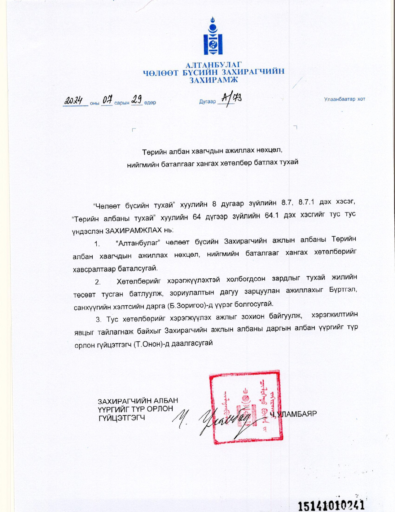 “Алтанбулаг" чөлөөт бүсийн Захирагчийн ажлын алба / Засгийн газрын 11-р байр 11 давхар, ЧД, Улаанбаатар/ +97651261430