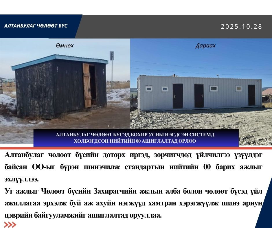 АЛТАНБУЛАГ ЧӨЛӨӨТ БҮСЭД БОХИР УСНЫ НЭГДСЭН СИСТЕМД ХОЛБОГДСОН НИЙТИЙН 00 АШИГЛАЛТАД ОРЛОО