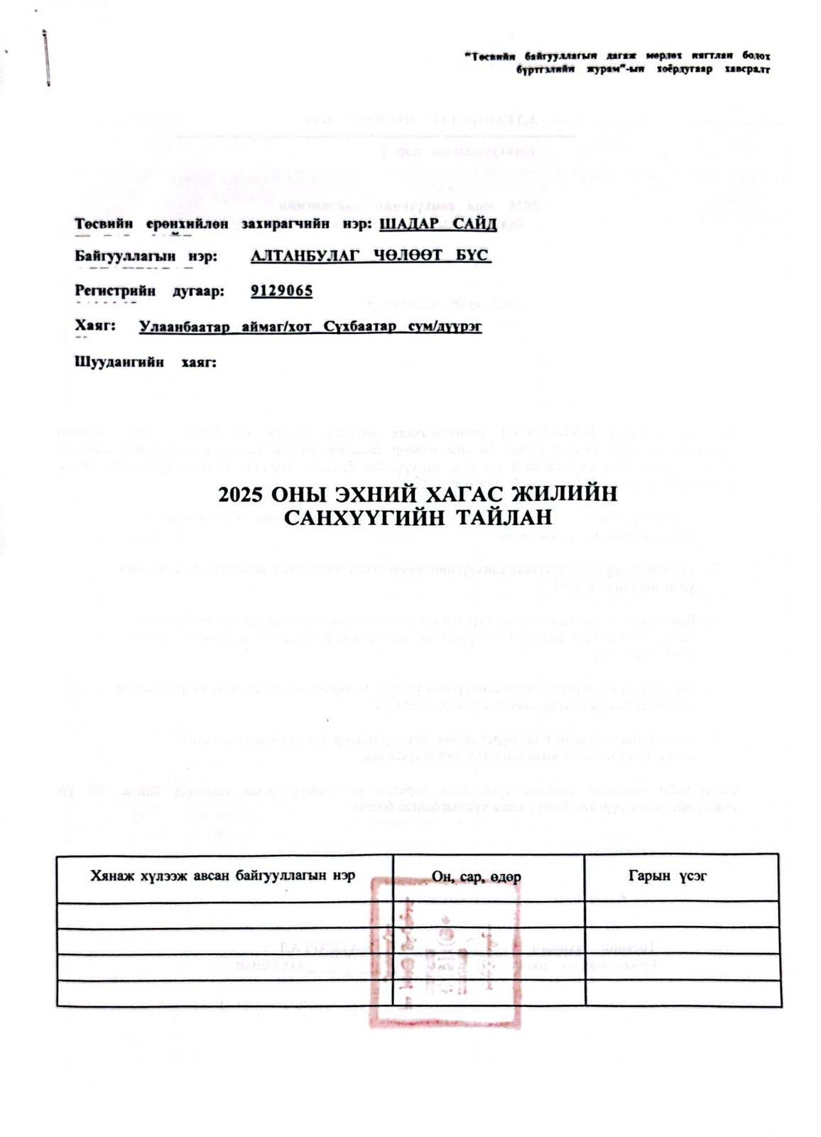 2025 ОНЫ ЭХНИЙ ХАГАС ЖИЛИЙН САНХҮҮГИЙН ТАЙЛАН ТАТАЖ ҮЗЭХ >>>