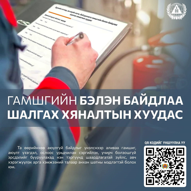 Онцгой байдлын байгууллагаас аливаа гамшиг, аюулт үзэгдэл, ослоос урьдчилан сэргийлэх, учирч болзошгүй эрсдэлийг бууруулах, анхан шатны мэдлэг эзэмшүүлэх зорилгоор хялбаршуулсан асуумж бүхий хяналтын хуудсыг боловсруулж, цахим хэлбэрт шилжүүлэн байршуулаад байна.