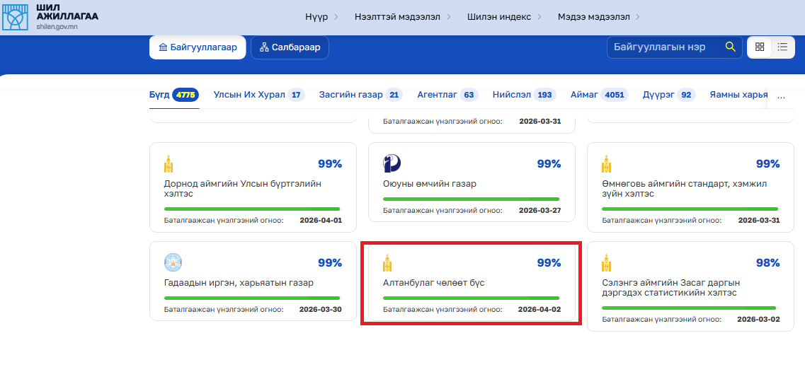 Алтанбулаг чөлөөт бүсийн Захирагчийн ажлын алба нь 2026 оны I улиралд Шилэн мэдээллийн сан буюу shilen.gov.mn сайтын нээлттэй мэдээллийн ил тод байдлын үнэлгээгээр 99.01 хувийн үнэлгээ авлаа.Нийтийн мэдээллийн ил тод байдлын тухай хуулийн 6, 8, 10 дугаар зүйлд заасны дагуу мэдээлэл хариуцагч байгууллагууд нь ил тод, нээлттэй байлгах 87 төрлийн мэдээллийг олон нийтэд нээлттэй байршуулах үүрэгтэй. Үүний хүрээнд Алтанбулаг чөлөөт бүсийн Захирагчийн ажлын алба нь өөрийн эрхлэх чиг үүргийн дагуу үйл ажиллагааны стратеги, зохион байгуулалт, хүний нөөц, төсөв, санхүү, худалдан авах ажиллагаа, байгууллагаас үзүүлж буй үйлчилгээний талаарх мэдээллийг ил тод, нээлттэй байршуулж, хуулийн хэрэгжилтийг хангаж ажиллав.